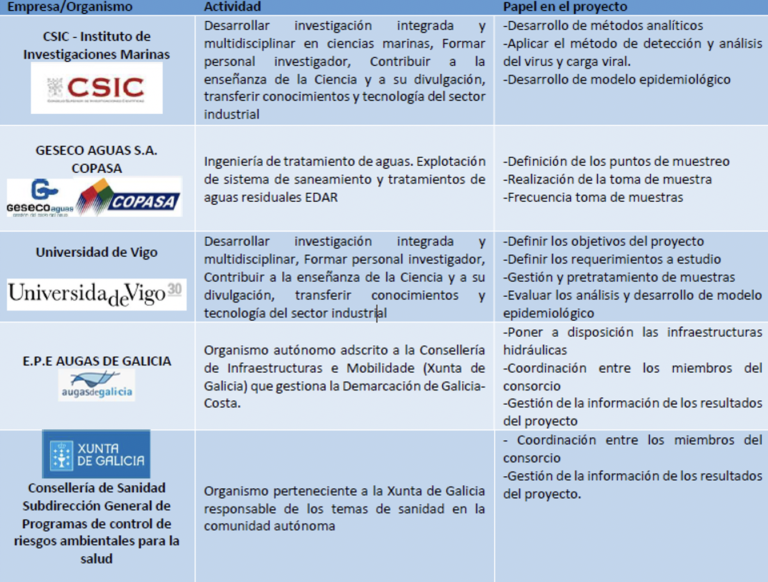 El objetivo principal de este estudio es determinar la presencia de virus mediante análisis en las aguas residuales en plantas depuradoras y a través de bioindicadores marinos. En función de los resultados de los análisis se podrá estimar la carga viral y la infectividad del virus, así como hacer una modelización de la evolución de la enfermedad. La presencia y concentración del virus en las aguas residuales darán una información fundamental para estimar la evolución de la pandemia en la comunidad que vierte sus aguas a la planta de tratamiento muestreada. Dada la singularidad de la comunidad autónoma de Galicia en cuanto a recursos marinos, se procederá también a realizar un estudio de la afección del agua residual vertida a través de fauna marina usando moluscos o crustáceos, ya sean salvajes o de polígonos marisqueros, sirviendo estos de bioindicadores para la detección del virus.